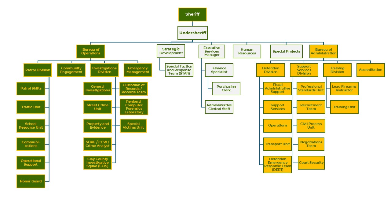 The Clay County Sheriff's Office is composed of nine divisions, each led by a commander or director: Patrol, Investigations, Community Services, Professional Standards, Administrative, Detention, Emergency Management, Human Resources, and our Law Enforcement Resource Center.